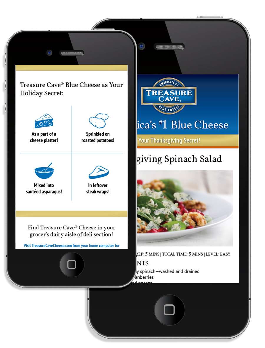National FSI placements appeal to Boomers, while new mobile-optimized recipe microsites, driven by QR codes on-pack, help a newer generation discover the Treasure Cave® secret for themselves. Seasonality and occasion help define which recipes are highlighted, improving weekday usage. FSIs also offer coupons, enticing consumers to take advantage of the premium product at a greater value.